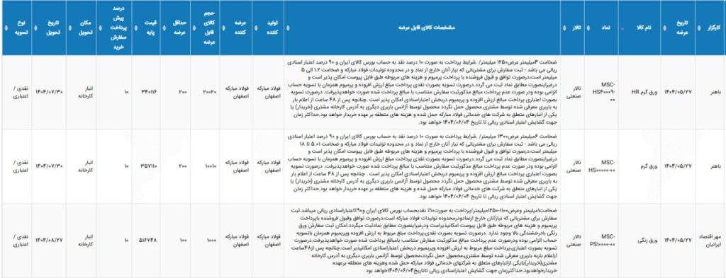 بر اساس اطلاعات منتشر شده، فولاد مبارکه در این عرضه سه محصول مهم خود را روانه تالار صنعتی بورس کالا کرده است. نخستین محصول، ورق گرم با ضخامت ۲.۵ میلی‌متر و حجم ۲۰۰ تن است که با نماد معاملاتی MSC-HSF۴۰۰-۰۰۰ عرضه شده و قیمت پایه آن ۳۴۰,۱۶۴ ریال به ازای هر کیلوگرم اعلام گردیده است. نحوه تسویه این کالا به‌صورت نقدی و اعتباری بوده و خریداران می‌بایست ۱۰ درصد از ارزش معامله را به‌عنوان پیش‌پرداخت هنگام ثبت سفارش واریز کنند. تاریخ تحویل این محموله ۳۰ مرداد ۱۴۰۴ تعیین شده است.