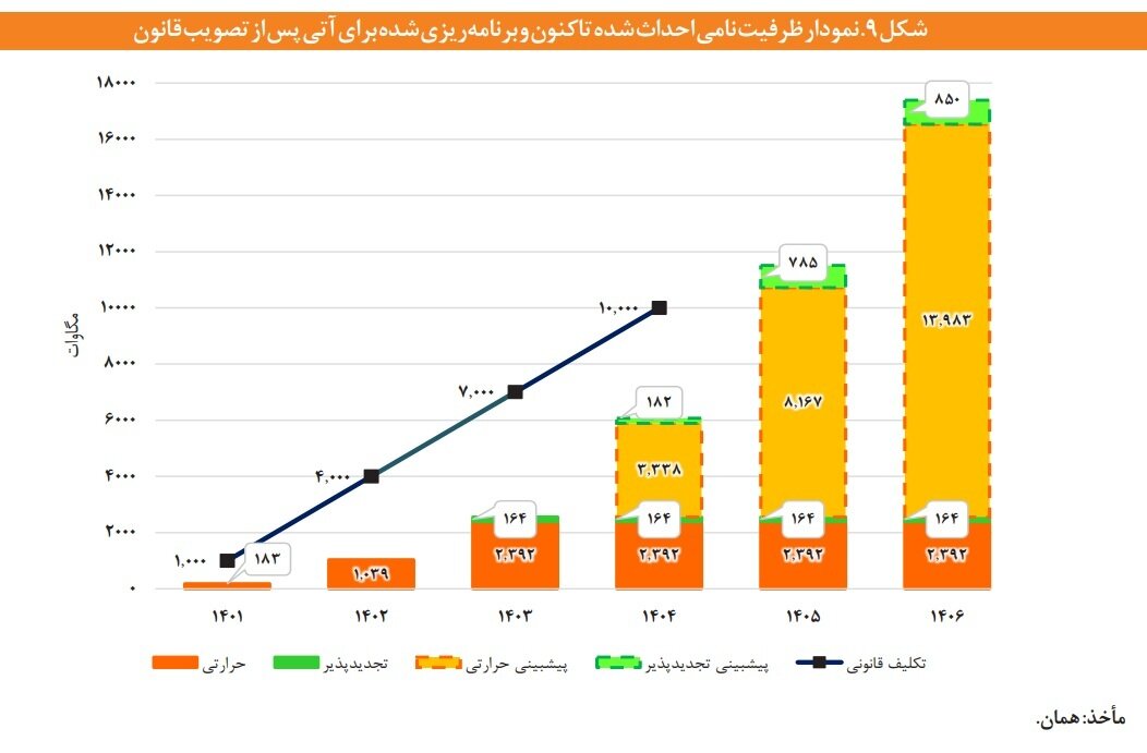 گزارش مرکز پژوهش‌های مجلس پیش‌بینی می‌کند با بهره‌برداری از نیروگاه‌های در دست اجرا، ظرفیت برق صنایع بزرگ تا پایان ۱۴۰۴ به ۶,۰۷۶ مگاوات برسد. از این میزان، ۴,۱۴۲ مگاوات توسط صنایع معدنی و ۱,۹۳۵ مگاوات توسط صنایع غیرمعدنی ایجاد خواهد شد. تحقق قانون تا انتهای مهلت مقرر، ۶۱ درصد پیش‌بینی شده است. در بخش حرارتی میزان تحقق ۶۴ درصد و در بخش تجدیدپذیر ۳۵ درصد خواهد بود.